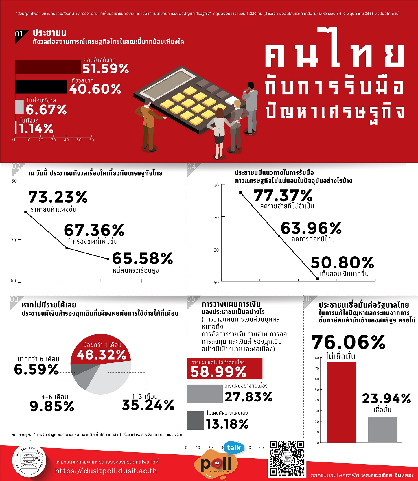 13 พ.ค. 68 – “สวนดุสิตโพล” มหาวิทยาลัยสวนดุสิต สำรวจความคิดเห็นประชาชนทั่วประเทศ เรื่อง “คนไทยกับการรับมือปัญหาเศรษฐกิจ” กลุ่มตัวอย่างจำนวน 1,229 คน (สำรวจทางออนไลน์และภาคสนาม) ระหว่างวันที่ 6-9 พฤษภาคม 2568 พบว่า กลุ่มตัวอย่างมองว่าสถานการณ์เศรษฐกิจไทย ณ วันนี้ ทำให้ค่อนข้างกังวล ร้อยละ 51.59 โดยเรื่องที่กังวลมากที่สุดคือเรื่อง ราคาสินค้าแพงขึ้น ร้อยละ 73.23 ทั้งนี้หากไม่มีรายได้เลย ประชาชนจะมีเงินสำรองฉุกเฉินต่อไปได้น้อยกว่า 1 เดือน ร้อยละ 48.32 โดยมีแนวทางการรับมือคือลดรายจ่ายที่ไม่จำเป็น ร้อยละ 77.37 ด้านการวางแผนการเงินส่วนบุคคล พบว่า ส่วนใหญ่มีการวางแผนแต่ไม่ได้ทำต่อเนื่อง ร้อยละ 58.99 สุดท้ายเมื่อถามถึงความเชื่อมั่นต่อรัฐบาลในการแก้ไขปัญหาผลกระทบจากการขึ้นภาษีสินค้านำเข้าของสหรัฐฯ ร้อยละ 76.06 ไม่เชื่อมั่นและร้อยละ 23.94 เชื่อมั่น