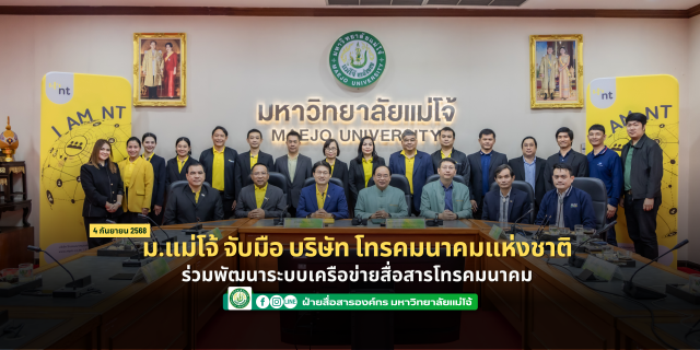 วันพฤหัสบดีที่ 2 ตุลาคม 2568 มหาวิทยาลัยแม่โจ้ มีพิธีลงนามบันทึกความร่วมมือทางวิชาการ กับ บริษัท โทรคมนาคมแห่งชาติ จำกัด (มหาชน) เพื่อพัฒนาระบบเครือข่ายสื่อสารโทรคมนาคมร่วมกัน โดยได้รับเกียรติจาก รองศาสตราจารย์ ดร.วีระพล ทองมา อธิการบดีมหาวิทยาลัยแม่โจ้ และ นายธนากร ทองใบ ผู้ช่วยกรรมการผู้จัดการใหญ่กลุ่มขายและปฏิบัติการลูกค้าภาคเหนือ บริษัท โทรคมนาคมแห่งชาติ จำกัด (มหาชน) เป็นผู้แทนลงนามทั้งสองฝ่าย ทั้งนี้ มี ผู้บริหารของทั้งสองหน่วยงาน ร่วมเป็นพยาน ณ ห้องประชุมรวงผึ้ง ชั้น 5 อาคารสำนักงานมหาวิทยาลัย มหาวิทยาลัยแม่โจ้