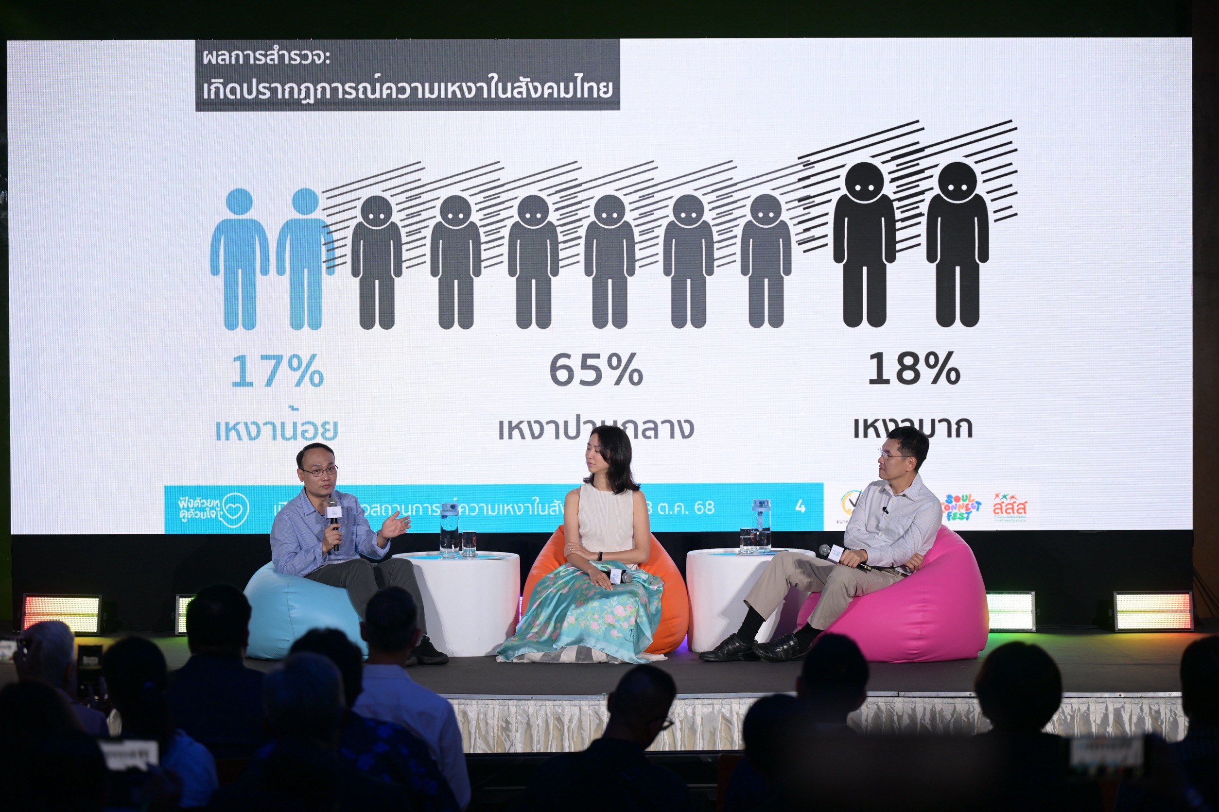 “ผลสำรวจฯ พบว่า คนไทยมีความเหงาสูงถึง 83% โดยแยกเป็นเหงามาก 18% และเหงาปานกลาง 65% สาเหตุจากการขาดกิจกรรมสร้างความสัมพันธ์เชื่อมโยงทั้งทางจิตใจและสังคม กลุ่มที่เสี่ยงต่อความเหงามากที่สุด คือ คนที่พักอาศัยอยู่ตามลำพัง คนที่พักอาศัยในเขตเมือง และคนที่มีปัญหาสุขภาพ เมื่อวิเคราะห์ตามกลุ่มอาชีพ พบว่า พนักงานออฟฟิศมีความเหงาสูงที่สุด ที่น่าสนใจ ยังพบอีกว่า คนไทย 1 ใน 5 รู้สึกว่าปัญญาประดิษฐ์ หรือ AI (Artificial Intelligence) สามารถให้คำปรึกษาได้ดีกว่าคนในครอบครัว และเพื่อน อาจเป็นเพราะ AI สามารถรับฟังแบบไม่ตัดสิน และแสดงความเห็นอกเห็นใจได้ตรงใจกว่า ทั้งนี้ ความเหงาที่เกิดขึ้น เป็นสาเหตุที่นำไปสู่ปัญหาทางสุขภาพใจ เช่น โรคซึมเศร้า ภาวะวิตกกังวล และเครียดสะสม กระทบโดยตรงต่อสุขภาพ ใน ‘เดือนการฟังแห่งชาติ’ ครั้งนี้ สสส. ส่งเสริมให้ประชาชนมีศักยภาพและความสามารถในการบริหารจัดการความรู้สึกเหงา ผ่านการเรียนรู้ทักษะการฟังด้วยตัวเอง รวมถึงสนับสนุนให้ทุกองค์กร ร่วมสร้างพื้นที่การรับฟังเชื่อมความสัมพันธ์คนในสังคม พร้อมเป็นส่วนหนึ่งในการขับเคลื่อนให้เกิดสังคมสุขภาวะที่เกื้อกูลกัน” ผู้จัดการกองทุน สสส. กล่าว