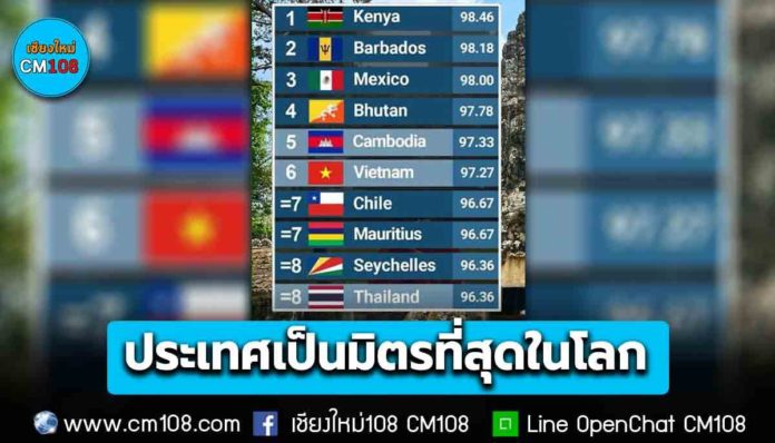 ทั้งนี้ ประเทศที่เป็นมิตรมากที่สุดในโลก อันดับที่ 1 ได้แก่ “เคนยา” ซึ่งได้คะแนนไป 98.46 คะแนน ตามมาด้วยอันดับที่ 2 คือ บาร์เบโดส 98.18 คะแนน และ เม็กซิโก อันดับที่ 3 98.00 คะแนน