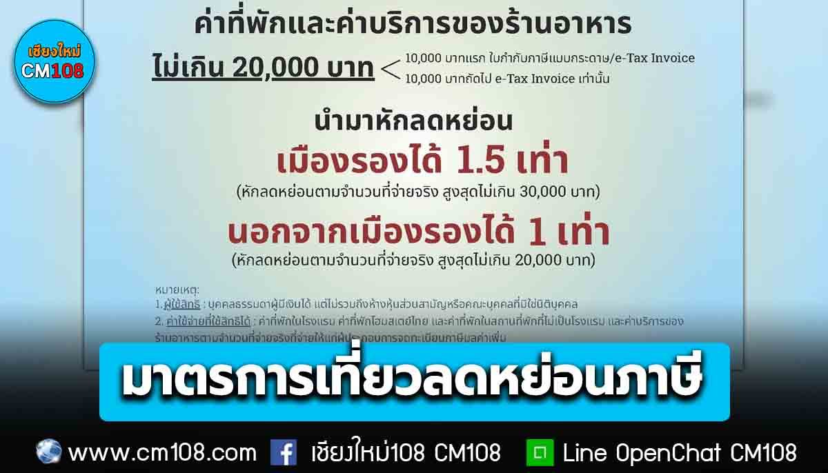 1. มาตรการภาษีสำหรับบุคคลธรรมดาเพื่อสนับสนุนการท่องเที่ยวให้บุคคลธรรมดานำค่าที่พักในโรงแรม ค่าที่พักโฮมสเตย์ไทย หรือค่าที่พักในสถานที่พักที่ไม่เป็นโรงแรม และค่าบริการของร้านอาหารที่จ่ายให้แก่ผู้ประกอบการจดทะเบียนภาษีมูลค่าเพิ่ม ตั้งแต่วันที่ 29 ตุลาคม ถึงวันที่ 15 ธันวาคม 2568 ในการเดินทางท่องเที่ยวในประเทศ สามาถนำมาหักลดหย่อนค่าใช้จ่ายจำนวนไม่เกิน 20,000 บาท ตามจำนวนที่จ่ายจริง ดังนี้