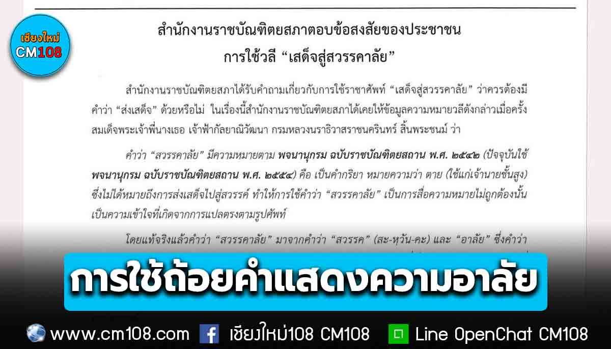25 ต.ค. 68 – สำนักงานราชบัณทิตยสภา ได้ให้แนวทางการใช้ราชาศัพท์และถ้อยคำเพื่อแสดงความอาลัยอย่างถูกต้องและเหมาะสม เมื่อปี พ.ศ. 2559 อ้างอิงจากคำชี้แจงของสำนักงานราชบัณทิตยสภา เมื่อครั้งการสวรรคตของ พระบาทสมเด็จพระบรมชนกาธิเบศร มหาภูมิพลอดุลยเดชมหาราช บรมนาถบพิตร ซึ่งได้อธิบายการใช้วลี “เสด็จสู่สวรรคาลัย” ว่า ควร ละการใช้คำว่า “ส่ง” และใช้ถ้อยคำว่า “เสด็จสู่สวรรคาลัย” หรือ “พระผู้เสด็จสู่สวรรคาลัย” เพื่อความถูกต้องตามหลักราชาศัพท์ และเพื่อให้ถ้อยคำมีความงดงาม เหมาะสมกับพระเกียรติยศ