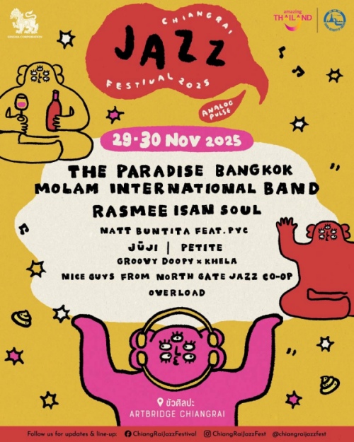จังหวัดเชียงรายเตรียมจัดงาน Chiang Rai Jazz Festival 2025: “Analog Pulse” เทศกาลดนตรีแจ๊สประจำปีที่มุ่งพัฒนาเชียงรายสู่การเป็น “New Jazz Destination of Thailand” ระหว่างวันที่ 29–30 พฤศจิกายน 2568 ณ พิพิธภัณฑ์ศิลปะร่วมสมัยเมืองเชียงราย (ขัวศิลปะ) ArtBridge Chiang Rai ตั้งแต่เวลา 15.00–24.00 น. โดยได้รับการสนับสนุนจากบริษัท บุญรอด เทรดดิ้ง จำกัด และการท่องเที่ยวแห่งประเทศไทย (ททท.) งานปีนี้จัดขึ้นภายใต้แนวคิด “Analog Pulse” เพื่อถ่ายทอดเสน่ห์ของซาวด์และจังหวะแบบแอนะล็อก เชิญชวนผู้ร่วมงาน “ช้าลงเพื่อฟัง” และสัมผัสประสบการณ์ดนตรีร่วมสมัยที่กลมกลืนกับครีเอทีฟซีนและวัฒนธรรมร่วมสมัยของจังหวัดเชียงราย นำเสนอผ่านวงดนตรีแจ๊สและศิลปินร่วมสมัยมากฝีมือ พร้อมกิจกรรมรับฟังบทเพลงรำลึกถึงพระมหากรุณาธิคุณสมเด็จพระพันปีหลวง