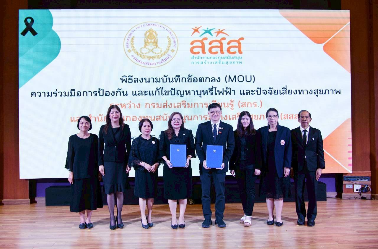 เมื่อวันที่ 16 ธ.ค. 68 – นพ.พงศ์เทพ วงศ์วัชรไพบูลย์ ผู้จัดการกองทุนสนับสนุนการสร้างเสริมสุขภาพ (สสส.) ลงนามในบันทึกข้อตกลงความร่วมมือการป้องกันและแก้ไขปัญหาบุหรี่ไฟฟ้าและปัจจัยเสี่ยงทางสุขภาพ ร่วมกับ ดร.เกศทิพย์ ศุภวานิช อธิบดีกรมส่งเสริมการเรียนรู้กรมส่งเสริมการเรียนรู้ (สกร.) กระทรวงศึกษาธิการ (ศธ.) เพื่อร่วมกันการดำเนินงานเชิงรุกในการสร้างสิ่งแวดล้อมการเรียนรู้และสังคมปลอดบุหรี่และบุหรี่ไฟฟ้าอย่างเป็นระบบและยั่งยืน