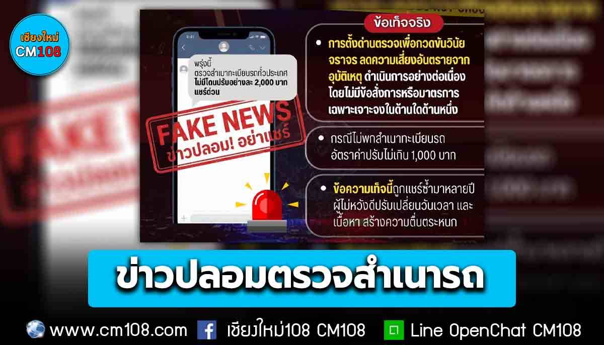 23 ม.ค. 69 – พล.ต.ท.ชัยต์พจน สูวรรณรักษ์ ผู้บัญชาการสำนักงานกำลังพล/รองโฆษกสำนักงานตำรวจแห่งชาติ เปิดเผยว่า จากกรณีที่มีข่าวปรากฏในสื่อโซเชียลเกี่ยวกับเรื่อง “พรุ่งนี้ ตำรวจจราจรทั่วประเทศจะเริ่มตั้งด่านเพื่อตรวจสำเนาทะเบียนรถ และ พรบ.ทุกคัน ผู้ใช้รถทุกท่านต้องเตรียมเอกสารติดรถด้วย สำเนาทุกอย่างไม่มี โดนค่าปรับอย่างละ 2,000 บาท” นั้น สำนักงานตำรวจแห่งชาติยืนยันว่าเป็น “ข่าวปลอม” โดยข้อความดังกล่าวเคยมีการแชร์กันมาแล้วเมื่อหลายปีที่ผ่านมา และสำนักงานตำรวจแห่งชาติได้เคยชี้แจงไปแล้วเพื่อไม่ให้พี่น้องประชาชนผู้ขับขี่ตื่นตระหนก