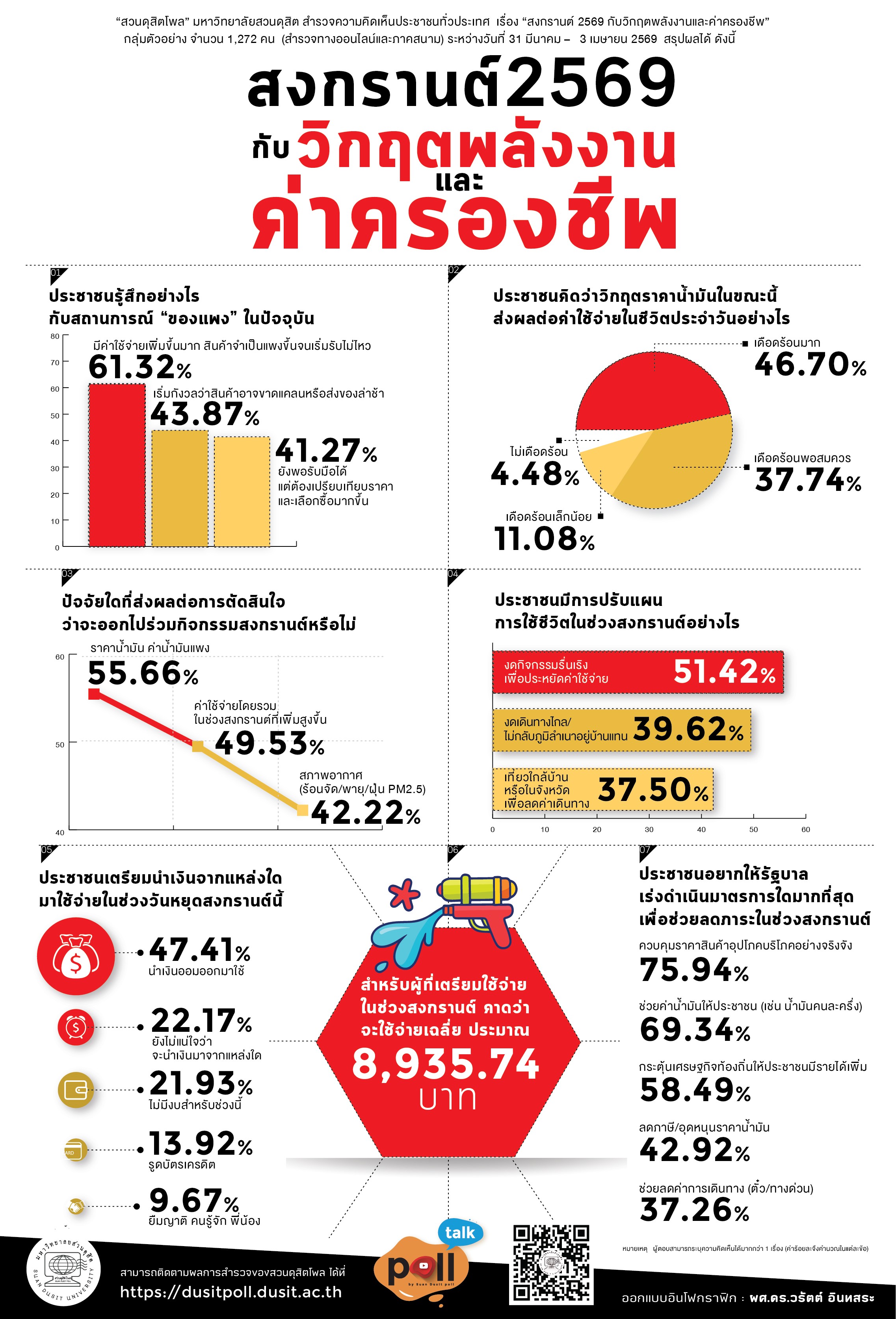 8 เม.ย. 69 – สวนดุสิตโพล มหาวิทยาลัยสวนดุสิต สำรวจความคิดเห็นประชาชนทั่วประเทศ เรื่อง สงกรานต์ 2569 กับวิกฤตพลังงานและค่าครองชีพ กลุ่มตัวอย่างจำนวน 1,272 คน (สำรวจทางออนไลน์และภาคสนาม) ระหว่างวันที่ 31 มีนาคม – 3 เมษายน 2569