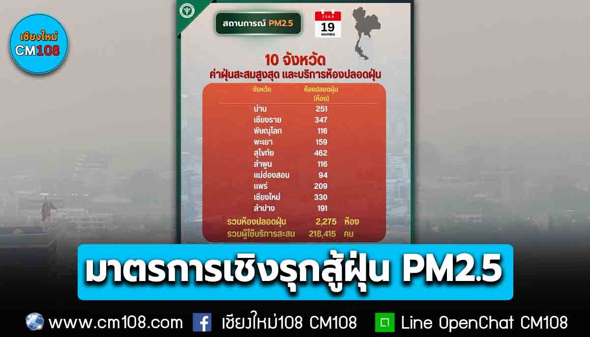 นพ.เอกชัยกล่าวต่อว่า มาตรการสำคัญที่กระทรวงสาธารณสุขดำเนินการมาอย่างต่อเนื่องหลายปี เพื่อบรรเทาความเดือดร้อนของประชาชนได้ทันที คือ การจัดตั้งห้องปลอดฝุ่น (Clean Room) ซึ่งปัจจุบันใน 10 จังหวัดเสี่ยงสูงดังกล่าวมีห้องปลอดฝุ่นที่ผ่านเกณฑ์และพร้อมให้บริการ รวม 2,275 ห้อง กระจายครอบคลุมทุกระดับเพื่อไม่ให้เป็นภาระในการเดินทางของประชาชน ได้แก่ โรงพยาบาลศูนย์ 84 ห้อง โรงพยาบาลทั่วไป 274 ห้อง โรงพยาบาลชุมชน 559 ห้อง และโรงพยาบาลส่งเสริมสุขภาพตำบล (รพ.สต.) 1,358 ห้อง มีผู้เข้าใช้บริการสะสม 218,415 คน สูงสุด คือ เชียงราย 156,068 คน ลำปาง 20,894 คน และพะเยา 20,005 คน สิ่งนี้สะท้อนว่าระบบที่เราวางไว้ทำงานได้จริง และเป็นที่พึ่งให้กับประชาชนในช่วงวิกฤตอากาศได้ นอกจากนี้ ในเรื่องของการรักษาพยาบาล กระทรวงสาธารณสุขได้เปิดให้บริการคลินิกมลพิษออนไลน์ และมีการนำระบบนัดหมายผ่านแอปพลิเคชัน “หมอพร้อม” มาใช้เพื่อความสะดวกในการเข้ารับบริการ ซึ่งทั้ง 10 จังหวัดเสี่ยงสูงมีคลินิกมลพิษออนไลน์ให้บริการ 128 แห่ง ผู้ป่วยรับบริการสะสม 3,675 ราย อย่าง จ.เชียงรายมีคลินิกมลพิษ 37 แห่ง มีผู้ป่วย 489 ราย ขณะที่ จ.เชียงราย มีคลินิกมลพิษออนไลน์ 7 แห่ง มีผู้ป่วยเข้ารับบริการมากที่สุด 985 ราย ส่วน จ.ลำปางมีการนัดหมายผ่านหมอพร้อมสูงสุดถึง 190 นัด
