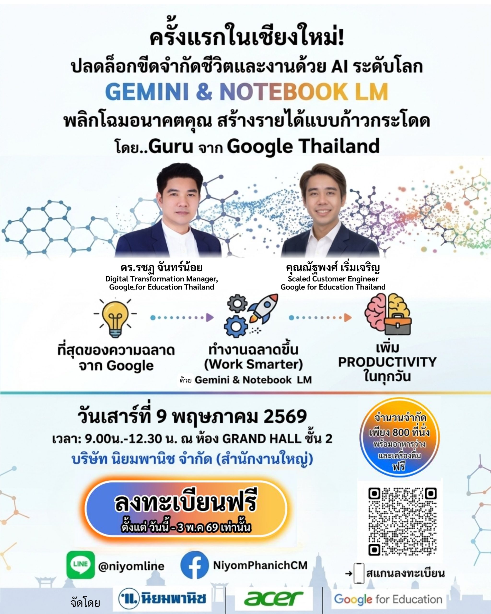เข้าร่วมได้ฟรี‼️ ชาวเชียงใหม่เตรียมตัวให้พร้อม โอกาสดี ๆ แบบนี้ไม่ได้มีบ่อย ๆ นิยมพานิช ร่วมกับ Google และ Acer ขอเชิญร่วมงานอบรมสัมนาสุดพิเศษ ปลดล็อกขีดจำกัดชีวิตและงาน ด้วย AI ระดับโลก GEMINI & NOTBOOK LM ที่จะพลิกโฉมอนาคตคุณ