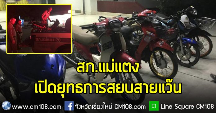 สภ.แม่แตง เปิดยุทธการสยบสายแว๊น ตามมาตรการป้องกันการจับกลุ่มวัยรุ่นแข่งรถในทางสาธารณะซึ่งเป็นเหตุให้เกิดอันตรายกับผู้ใช้ทางและก่อความเดือดร้อนรำคาญกับประชาชน ได้ทำการตรวจยึดรถจักรยานยนต์ไม่มีเอกสารการครองครอง ดัดแปลงสภาพรถ ท่อเสียงดัง อุปกรณ์ส่วนควบไม่ครบ นำส่งพงส.สภ.แม่แตง เพื่อดำเนินการตามกฎหมายต่อไป