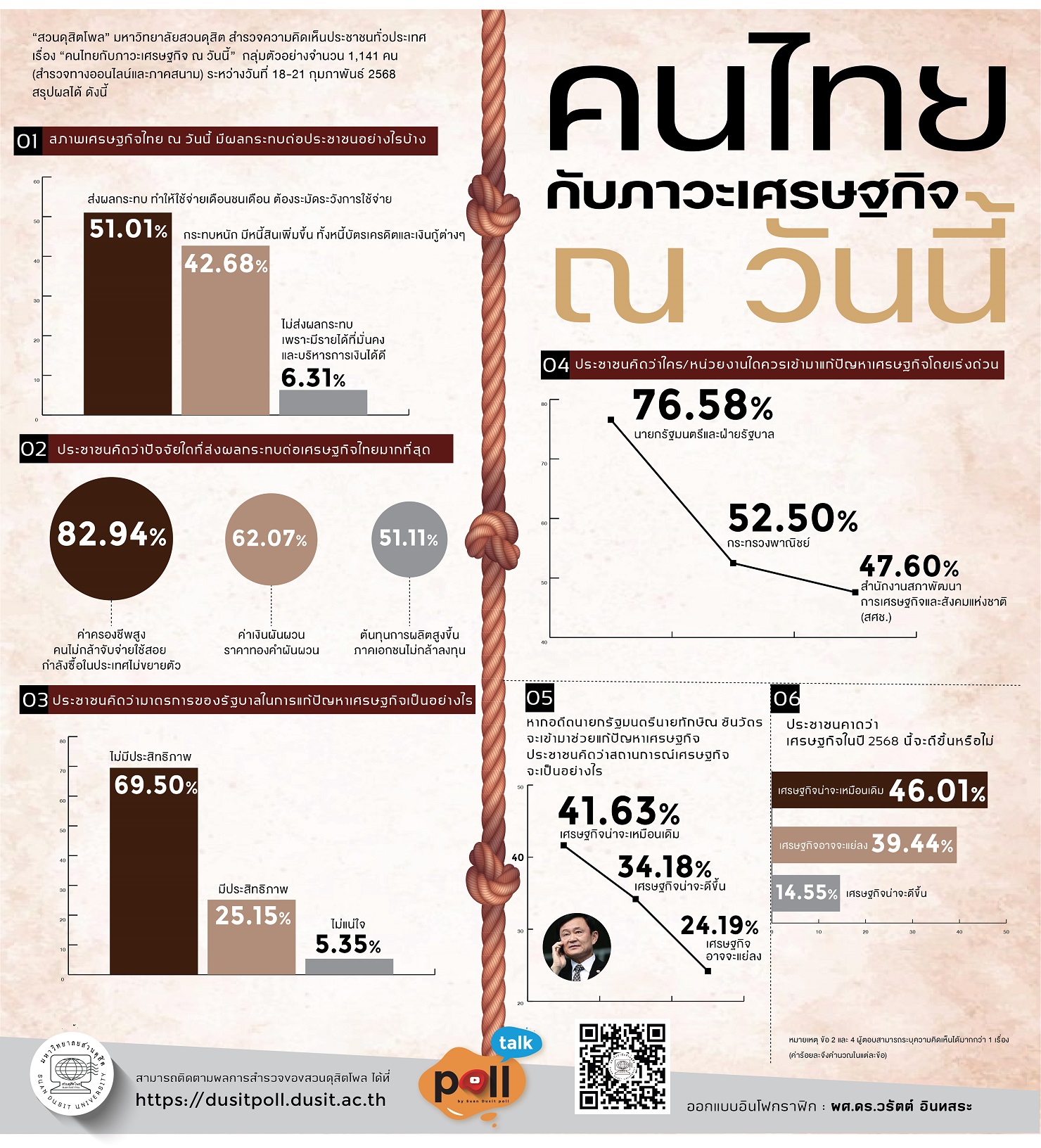 5 มี.ค. 68 – “สวนดุสิตโพล” มหาวิทยาลัยสวนดุสิต สำรวจความคิดเห็นประชาชนทั่วประเทศ เรื่อง “คนไทยกับภาวะเศรษฐกิจ ณ วันนี้” กลุ่มตัวอย่างจำนวน 1,141 คน (สำรวจทางออนไลน์และภาคสนาม) ระหว่างวันที่ 18-21 กุมภาพันธ์ 2568 พบว่า กลุ่มตัวอย่างมองว่าสภาพเศรษฐกิจไทย ณ วันนี้ส่งผลกระทบทำให้ใช้จ่ายเดือนชนเดือน ต้องระมัดระวังการใช้จ่าย ร้อยละ 51.01 โดยคิดว่าปัจจัยที่ส่งผลกระทบต่อเศรษฐกิจไทยมากที่สุด คือเรื่องค่าครองชีพ สูง คนไม่กล้าจับจ่ายใช้สอย กำลังซื้อในประเทศไม่ขยายตัว ร้อยละ 82.94 ทั้งนี้เห็นว่ามาตรการของรัฐบาลในการแก้ปัญหาเศรษฐกิจนั้นยั้งไม่มีประสิทธิภาพ ร้อยละ 69.50 โดยนายกรัฐมนตรีและฝ่ายรัฐบาลควรเข้ามาเร่งแก้ปัญหาโดยด่วน ร้อยละ 76.58 เมื่อถามว่าหากอดีตนายกรัฐมนตรี ทักษิณ ชินวัตร จะเข้ามาช่วยแก้ปัญหาเศรษฐกิจ ประชาชนคิดว่าสถานการณ์เศรษฐกิจจะเป็นอย่างไร กลุ่มตัวอย่างมองว่า เศรษฐกิจน่าจะเหมือนเดิม ร้อยละ 41.63 สุดท้ายเมื่อคาดการณ์เศรษฐกิจในปี 2568 นี้ ร้อยละ 46.01 มองว่าก็น่าจะเหมือนเดิมเช่นกัน